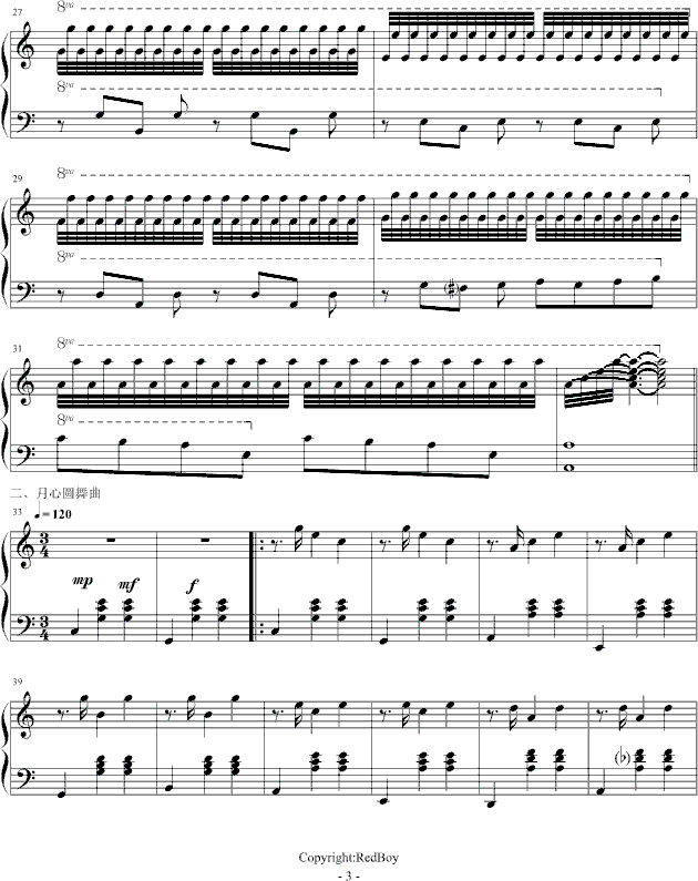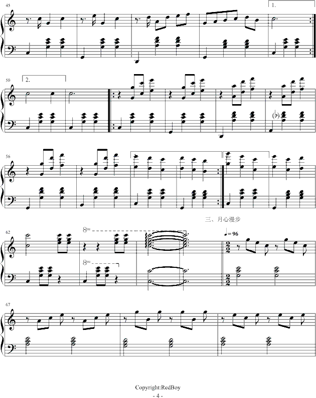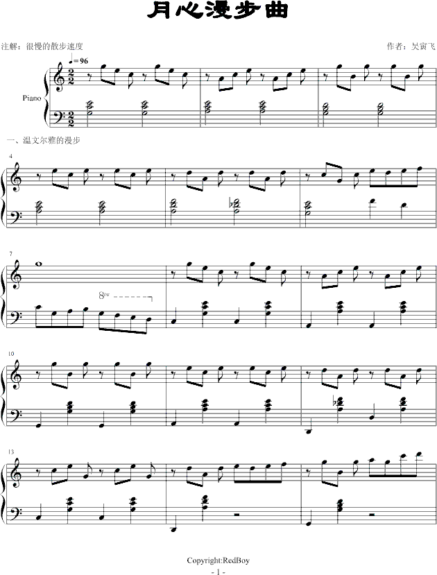 月心漫步曲钢琴谱上传者为网友上传,原创作者为网络转载,歌曲原唱歌手为佚名,本钢琴谱为图片格式,表现形式为五线谱,音乐性质为流行金曲。