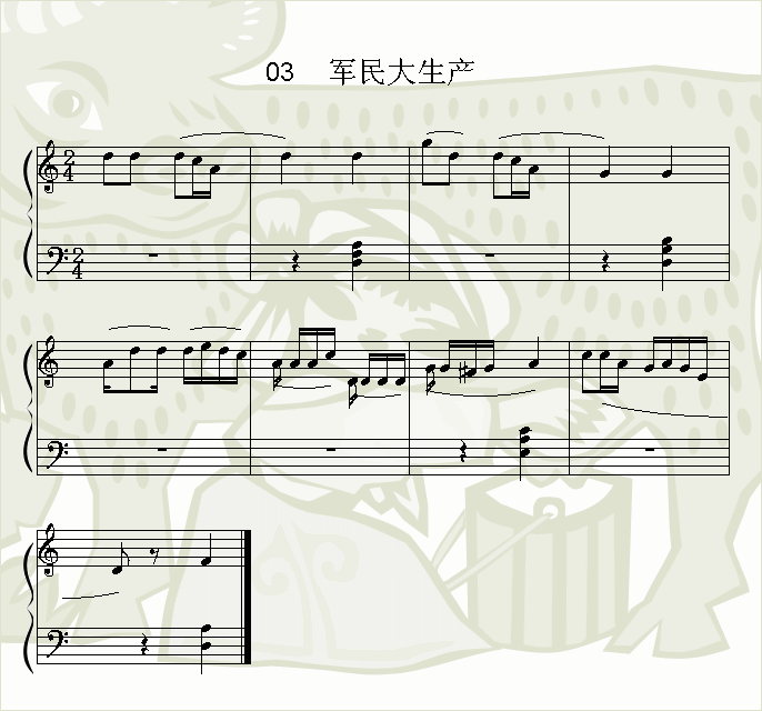 军民大生产钢琴谱上传者为网友上传,原创作者为网络转载,歌曲原唱歌手为佚名,本钢琴谱为图片格式,表现形式为五线谱,音乐性质为流行金曲。