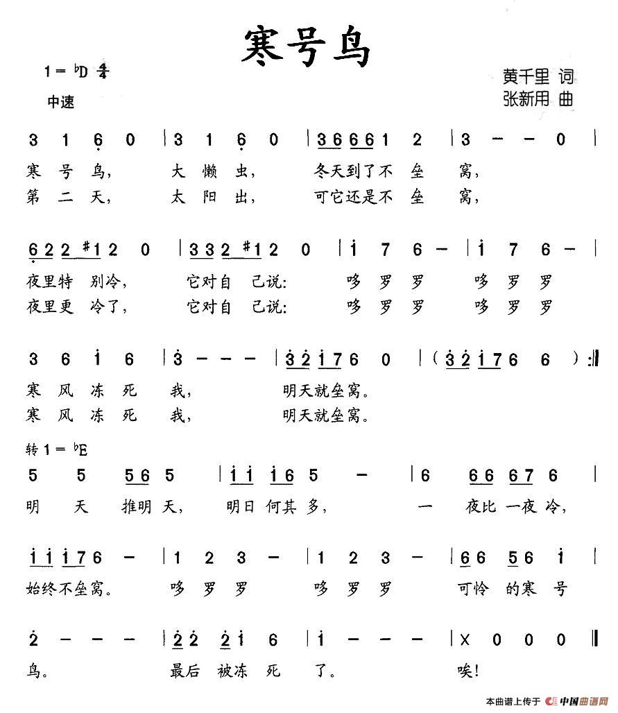 寒号鸟简谱上传者为网友上传,原创作者为网络转载,歌曲原唱歌手为佚名,本简谱为图片格式,表现形式为,音乐性质为流行金曲。