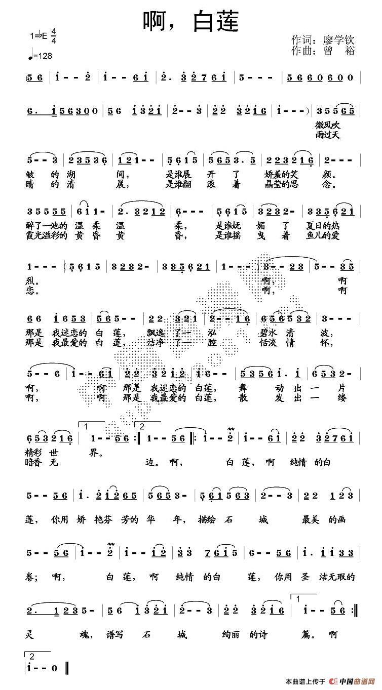 啊,白莲简谱上传者为网友上传,原创作者为网络转载,歌曲原唱歌手为佚名,本简谱为图片格式,表现形式为,音乐性质为流行金曲。