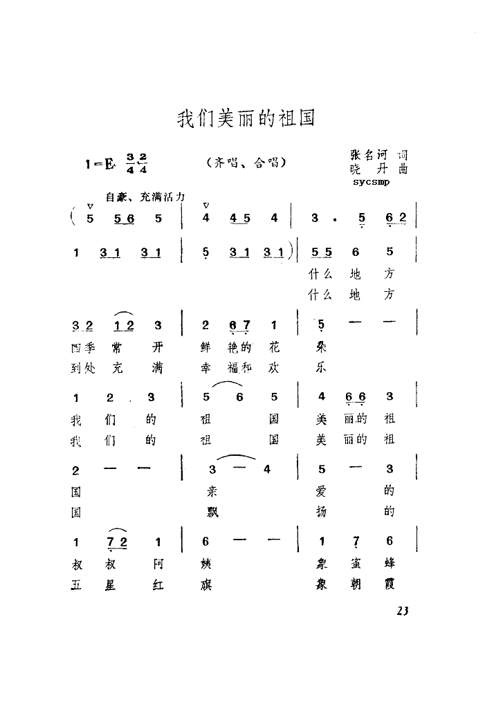 我们美丽的祖国简谱上传者为网友上传,原创作者为网络转载,歌曲原唱歌手为佚名,本简谱为图片格式,表现形式为,音乐性质为流行金曲。