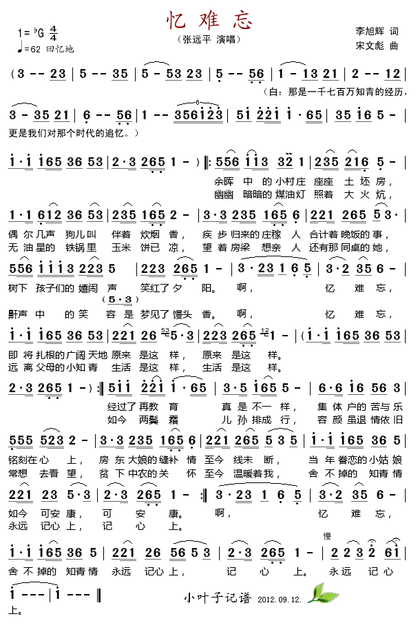 忆难忘简谱上传者为网友上传,原创作者为网络转载,歌曲原唱歌手为佚名,本简谱为图片格式,表现形式为,音乐性质为流行金曲。
