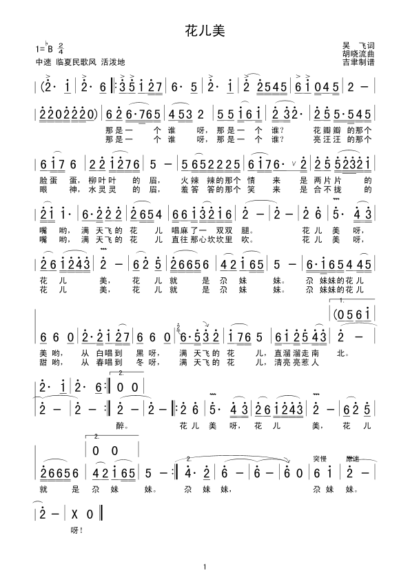 花儿美简谱上传者为网友上传,原创作者为网络转载,歌曲原唱歌手为佚名,本简谱为图片格式,表现形式为,音乐性质为流行金曲。
