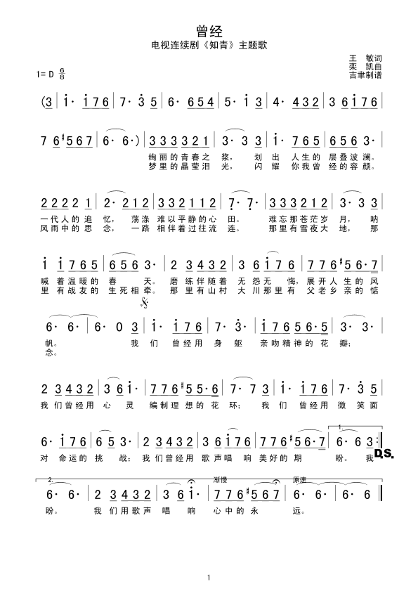 曾经简谱上传者为网友上传,原创作者为网络转载,歌曲原唱歌手为佚名,本简谱为图片格式,表现形式为,音乐性质为流行金曲。