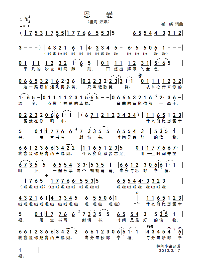 恩爱简谱上传者为网友上传,原创作者为网络转载,歌曲原唱歌手为佚名,本简谱为图片格式,表现形式为,音乐性质为流行金曲。