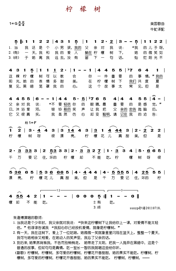 柠檬树简谱上传者为网友上传,原创作者为网络转载,歌曲原唱歌手为佚名,本简谱为图片格式,表现形式为,音乐性质为流行金曲。