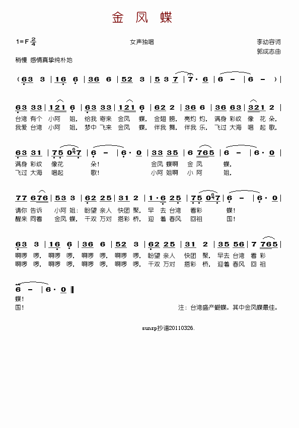 金凤蝶简谱上传者为网友上传,原创作者为网络转载,歌曲原唱歌手为佚名,本简谱为图片格式,表现形式为,音乐性质为流行金曲。