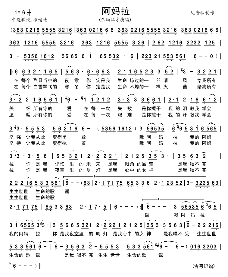 阿妈拉简谱上传者为网友上传,原创作者为网络转载,歌曲原唱歌手为佚名,本简谱为图片格式,表现形式为,音乐性质为流行金曲。