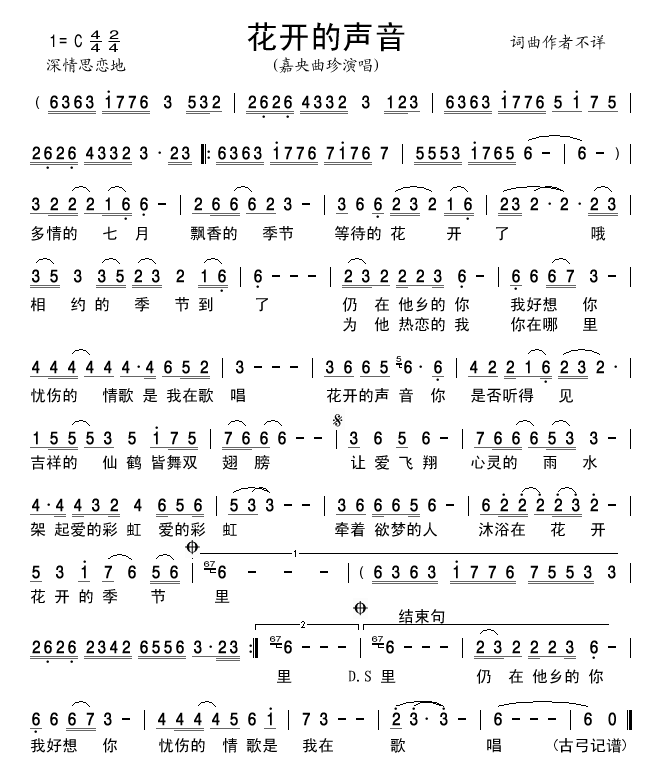 花开的声音简谱上传者为网友上传,原创作者为网络转载,歌曲原唱歌手为佚名,本简谱为图片格式,表现形式为,音乐性质为流行金曲。