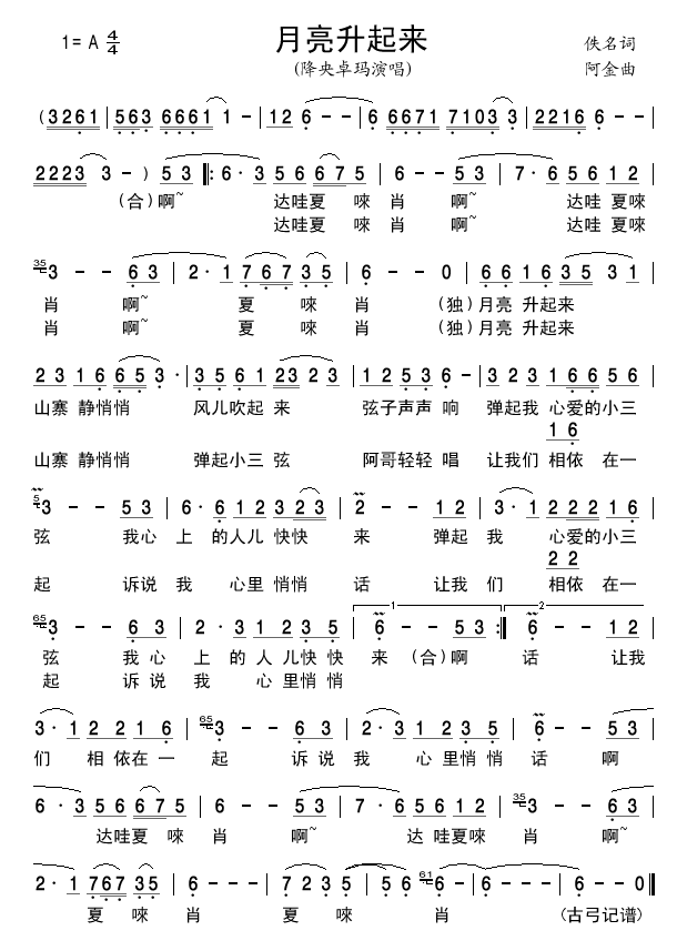 月亮升起来简谱上传者为网友上传,原创作者为网络转载,歌曲原唱歌手为佚名,本简谱为图片格式,表现形式为,音乐性质为流行金曲。