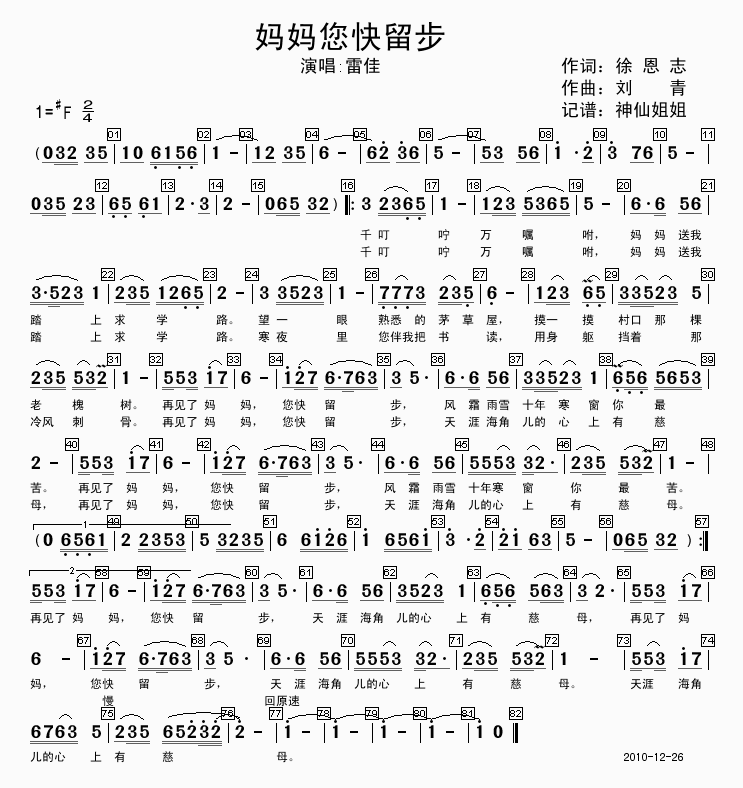 妈妈您快留步简谱上传者为网友上传,原创作者为网络转载,歌曲原唱歌手为佚名,本简谱为图片格式,表现形式为,音乐性质为流行金曲。