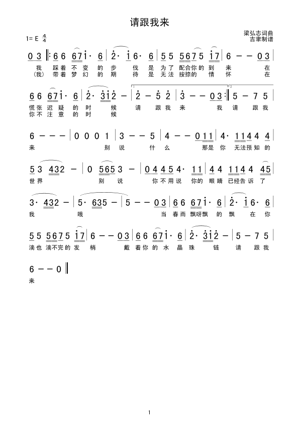 请跟我来简谱上传者为网友上传,原创作者为网络转载,歌曲原唱歌手为佚名,本简谱为图片格式,表现形式为,音乐性质为流行金曲。