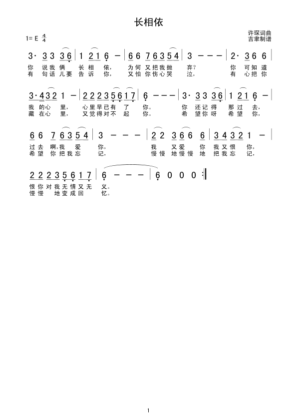 长相依简谱上传者为网友上传,原创作者为网络转载,歌曲原唱歌手为佚名,本简谱为图片格式,表现形式为,音乐性质为流行金曲。