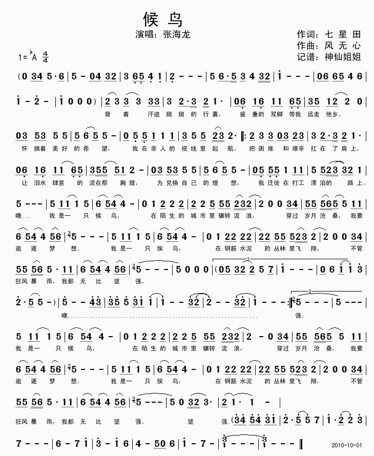 候鸟简谱上传者为网友上传,原创作者为网络转载,歌曲原唱歌手为佚名,本简谱为图片格式,表现形式为,音乐性质为流行金曲。