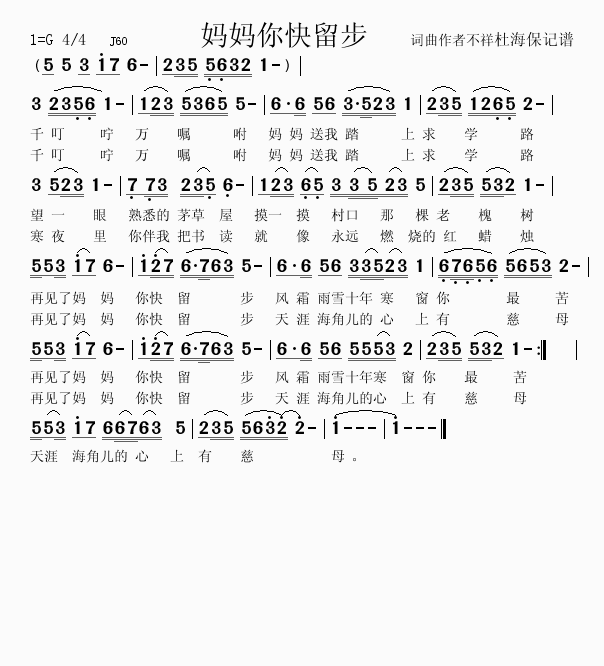 妈妈你快留步简谱上传者为网友上传,原创作者为网络转载,歌曲原唱歌手为佚名,本简谱为图片格式,表现形式为,音乐性质为流行金曲。