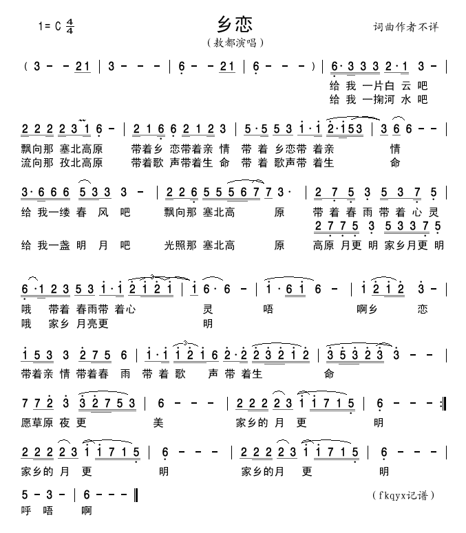 乡恋简谱上传者为网友上传,原创作者为网络转载,歌曲原唱歌手为佚名,本简谱为图片格式,表现形式为,音乐性质为流行金曲。
