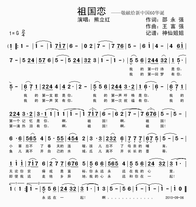 祖国恋简谱上传者为网友上传,原创作者为网络转载,歌曲原唱歌手为佚名,本简谱为图片格式,表现形式为,音乐性质为流行金曲。
