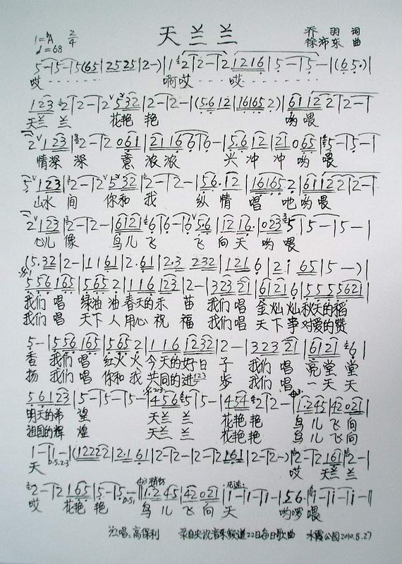 天兰兰简谱上传者为网友上传,原创作者为网络转载,歌曲原唱歌手为佚名,本简谱为图片格式,表现形式为,音乐性质为流行金曲。