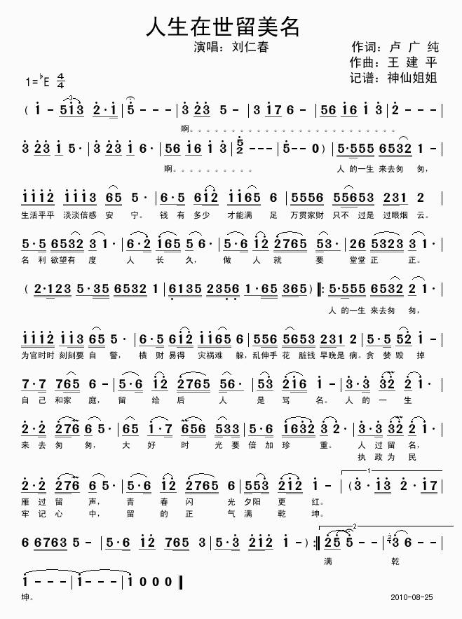 人生在世留美名简谱上传者为网友上传,原创作者为网络转载,歌曲原唱歌手为佚名,本简谱为图片格式,表现形式为,音乐性质为流行金曲。