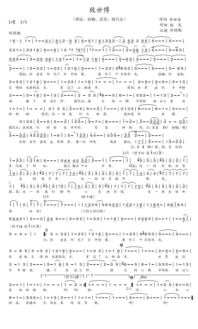致世博简谱上传者为网友上传,原创作者为网络转载,歌曲原唱歌手为佚名,本简谱为图片格式,表现形式为,音乐性质为流行金曲。
