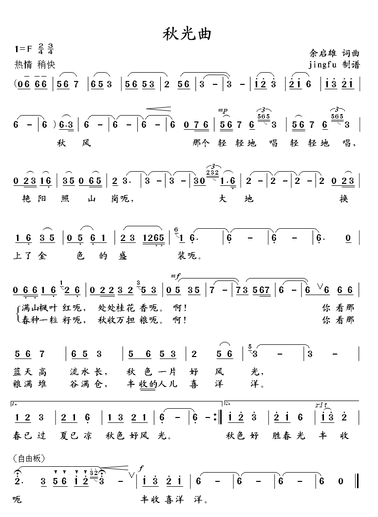 秋光曲简谱上传者为网友上传,原创作者为网络转载,歌曲原唱歌手为佚名,本简谱为图片格式,表现形式为,音乐性质为流行金曲。