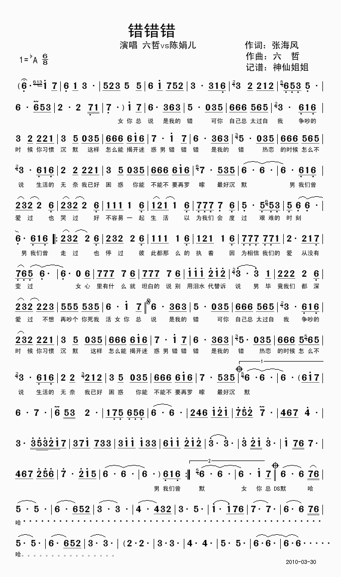 错错错简谱上传者为网友上传,原创作者为网络转载,歌曲原唱歌手为佚名,本简谱为图片格式,表现形式为,音乐性质为流行金曲。