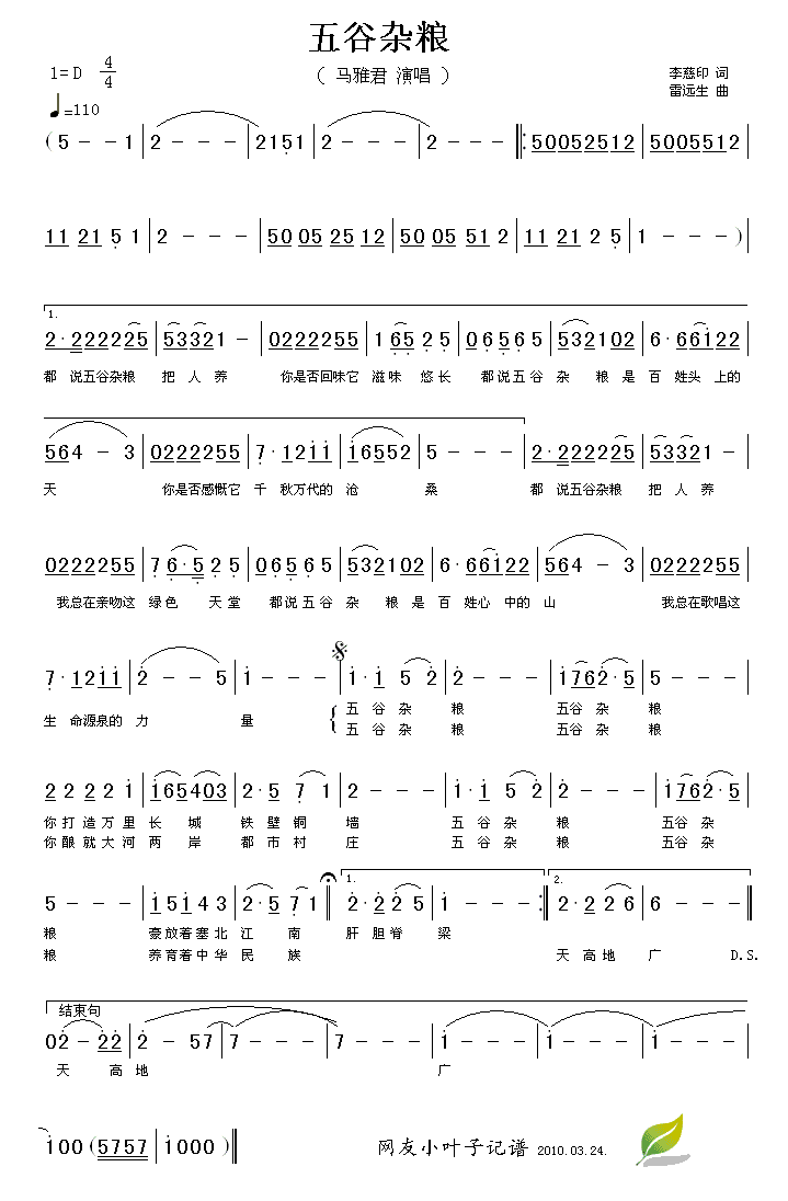 五谷杂粮简谱上传者为网友上传,原创作者为网络转载,歌曲原唱歌手为佚名,本简谱为图片格式,表现形式为,音乐性质为流行金曲。