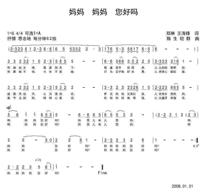 妈妈 妈妈 您好吗简谱上传者为网友上传,原创作者为网络转载,歌曲原唱歌手为佚名,本简谱为图片格式,表现形式为,音乐性质为流行金曲。