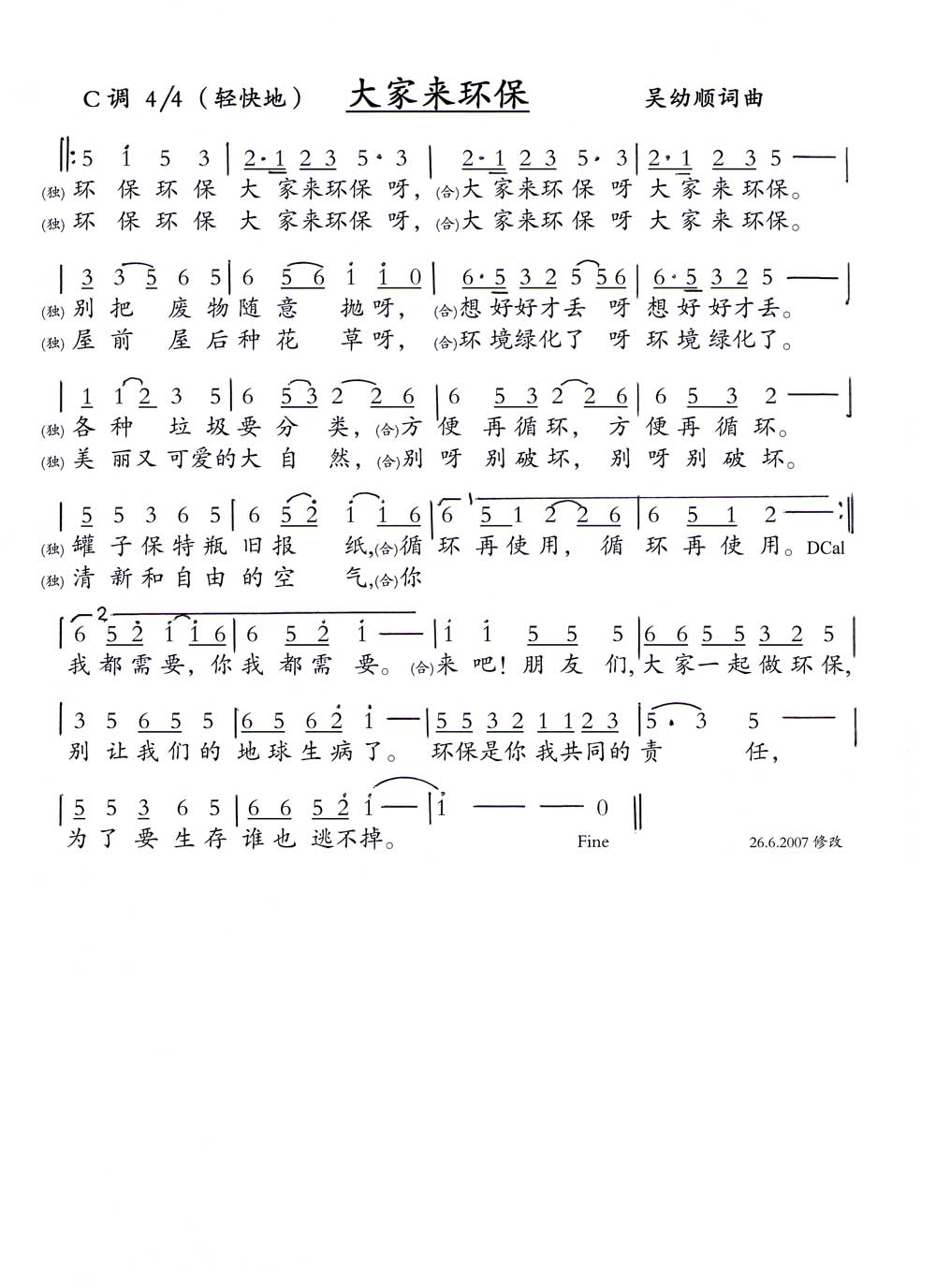 大家来环保简谱上传者为网友上传,原创作者为网络转载,歌曲原唱歌手为佚名,本简谱为图片格式,表现形式为,音乐性质为流行金曲。