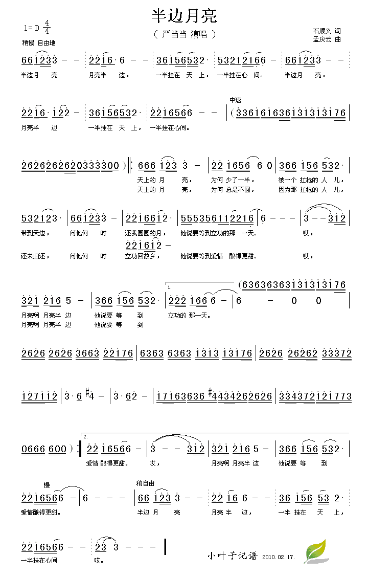 半边月亮简谱上传者为网友上传,原创作者为网络转载,歌曲原唱歌手为佚名,本简谱为图片格式,表现形式为,音乐性质为流行金曲。