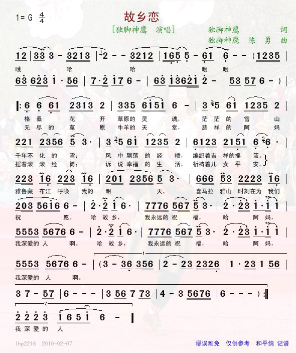 故乡恋简谱上传者为网友上传,原创作者为网络转载,歌曲原唱歌手为佚名,本简谱为图片格式,表现形式为,音乐性质为流行金曲。