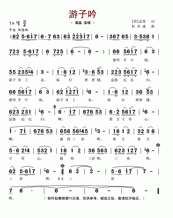 游子吟简谱上传者为网友上传,原创作者为网络转载,歌曲原唱歌手为佚名,本简谱为图片格式,表现形式为,音乐性质为流行金曲。
