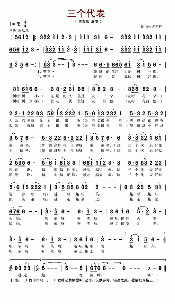 三个代表简谱上传者为网友上传,原创作者为网络转载,歌曲原唱歌手为佚名,本简谱为图片格式,表现形式为,音乐性质为流行金曲。