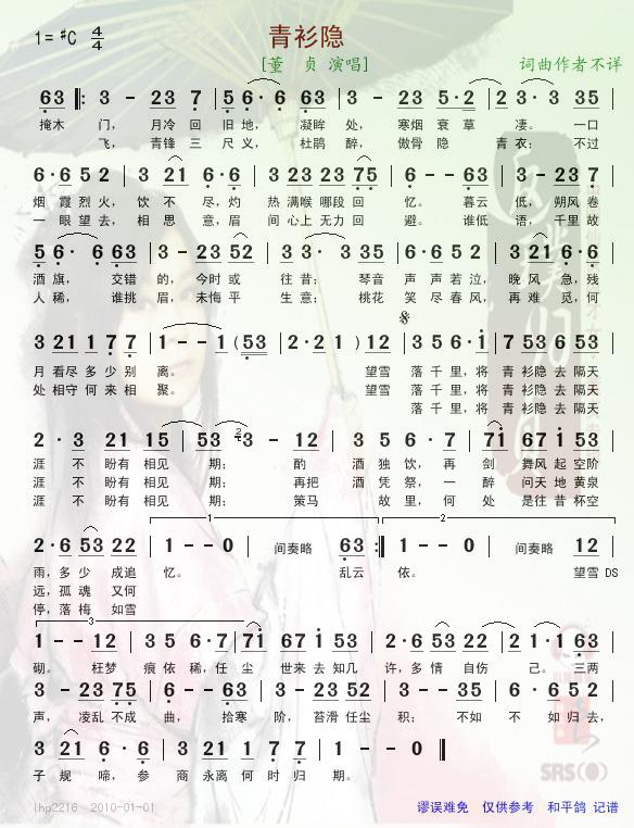 青衫隐简谱上传者为网友上传,原创作者为网络转载,歌曲原唱歌手为佚名,本简谱为图片格式,表现形式为,音乐性质为流行金曲。
