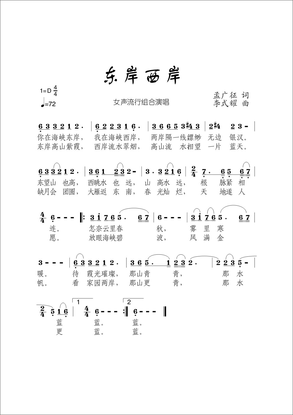 东岸西岸简谱上传者为网友上传,原创作者为网络转载,歌曲原唱歌手为佚名,本简谱为图片格式,表现形式为,音乐性质为流行金曲。