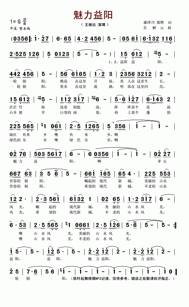 魅力益阳简谱上传者为网友上传,原创作者为网络转载,歌曲原唱歌手为佚名,本简谱为图片格式,表现形式为,音乐性质为流行金曲。