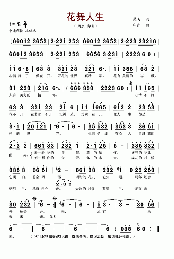 花舞人生简谱上传者为网友上传,原创作者为网络转载,歌曲原唱歌手为佚名,本简谱为图片格式,表现形式为,音乐性质为流行金曲。