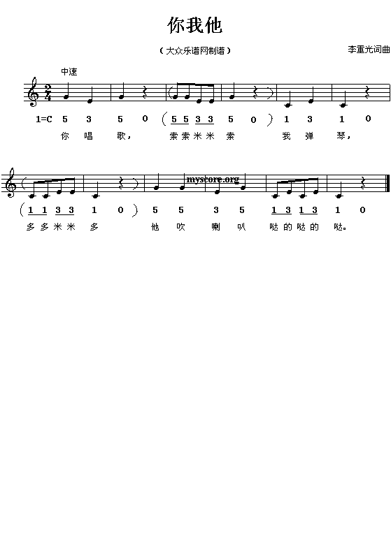 你我他简谱上传者为网友上传,原创作者为网络转载,歌曲原唱歌手为佚名,本简谱为图片格式,表现形式为,音乐性质为流行金曲。