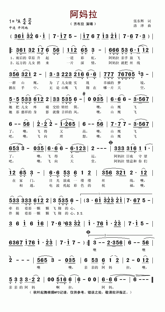 阿妈拉简谱上传者为网友上传,原创作者为网络转载,歌曲原唱歌手为佚名,本简谱为图片格式,表现形式为,音乐性质为流行金曲。