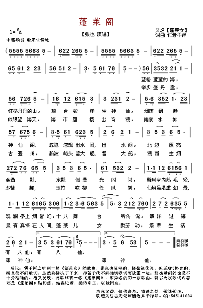 蓬莱阁简谱上传者为网友上传,原创作者为网络转载,歌曲原唱歌手为佚名,本简谱为图片格式,表现形式为,音乐性质为流行金曲。