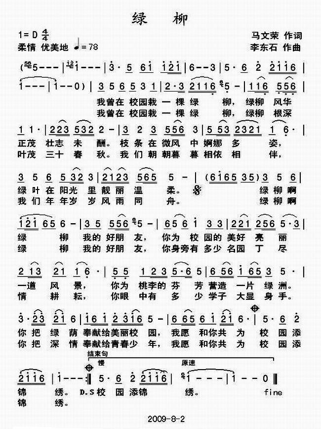 绿柳简谱上传者为网友上传,原创作者为网络转载,歌曲原唱歌手为佚名,本简谱为图片格式,表现形式为,音乐性质为流行金曲。