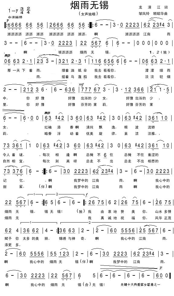 烟雨无锡简谱上传者为网友上传,原创作者为网络转载,歌曲原唱歌手为佚名,本简谱为图片格式,表现形式为,音乐性质为流行金曲。