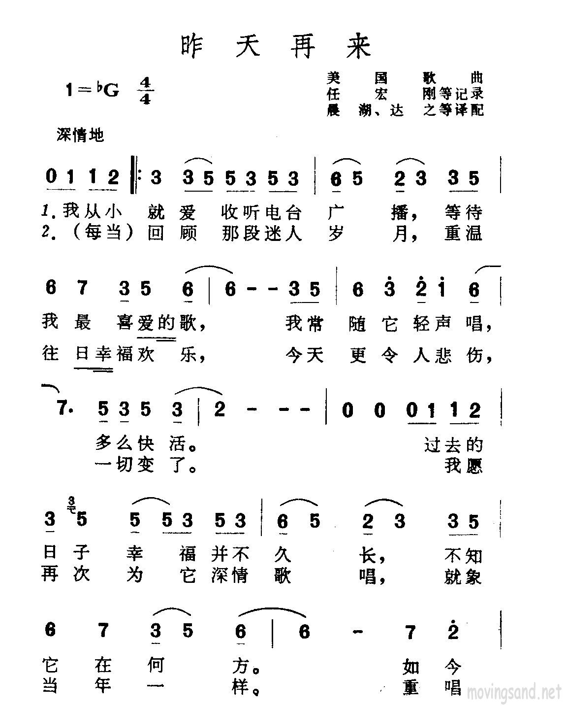 昨日再来简谱上传者为网友上传,原创作者为网络转载,歌曲原唱歌手为佚名,本简谱为图片格式,表现形式为,音乐性质为流行金曲。