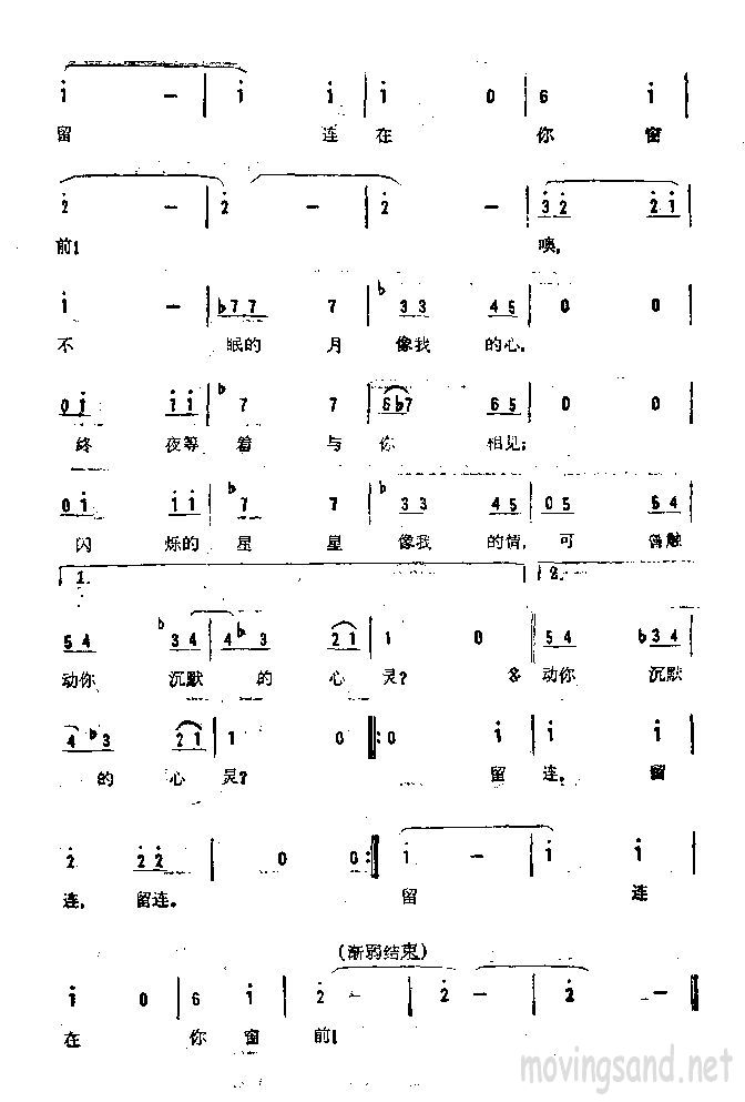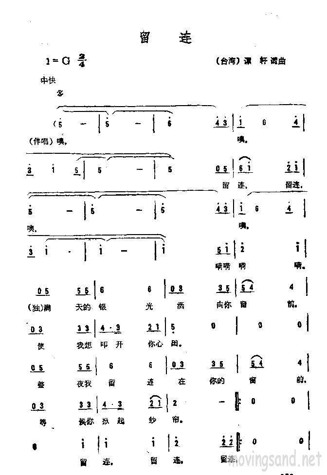 留连简谱上传者为网友上传,原创作者为网络转载,歌曲原唱歌手为佚名,本简谱为图片格式,表现形式为,音乐性质为流行金曲。