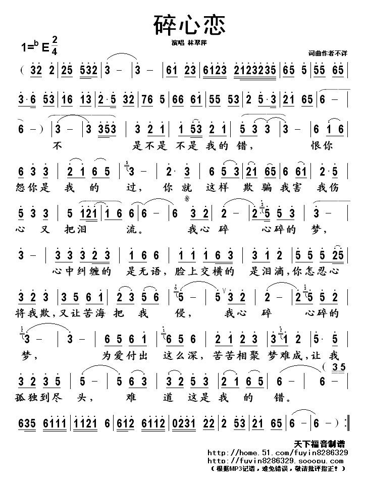 碎心恋简谱上传者为网友上传,原创作者为网络转载,歌曲原唱歌手为佚名,本简谱为图片格式,表现形式为,音乐性质为流行金曲。
