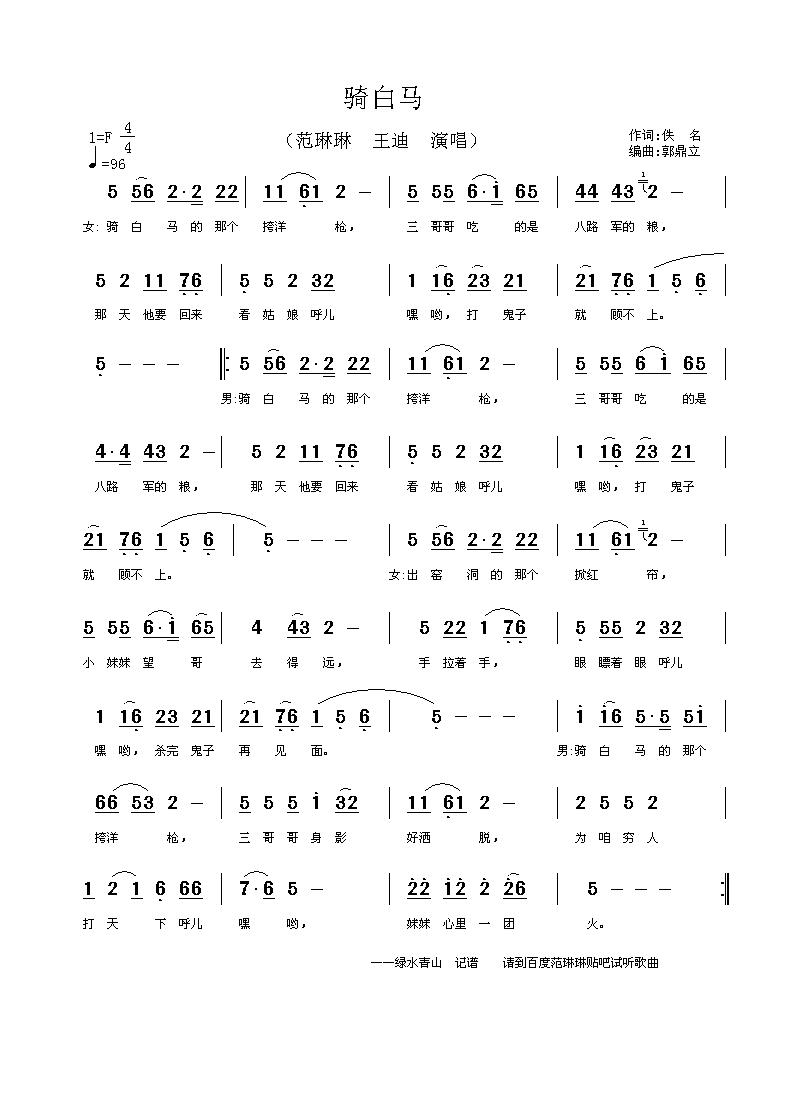 骑白马简谱上传者为网友上传,原创作者为网络转载,歌曲原唱歌手为佚名,本简谱为图片格式,表现形式为,音乐性质为流行金曲。