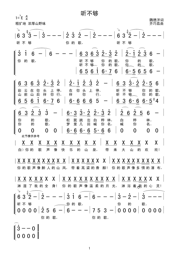 听不够简谱上传者为网友上传,原创作者为网络转载,歌曲原唱歌手为佚名,本简谱为图片格式,表现形式为,音乐性质为流行金曲。