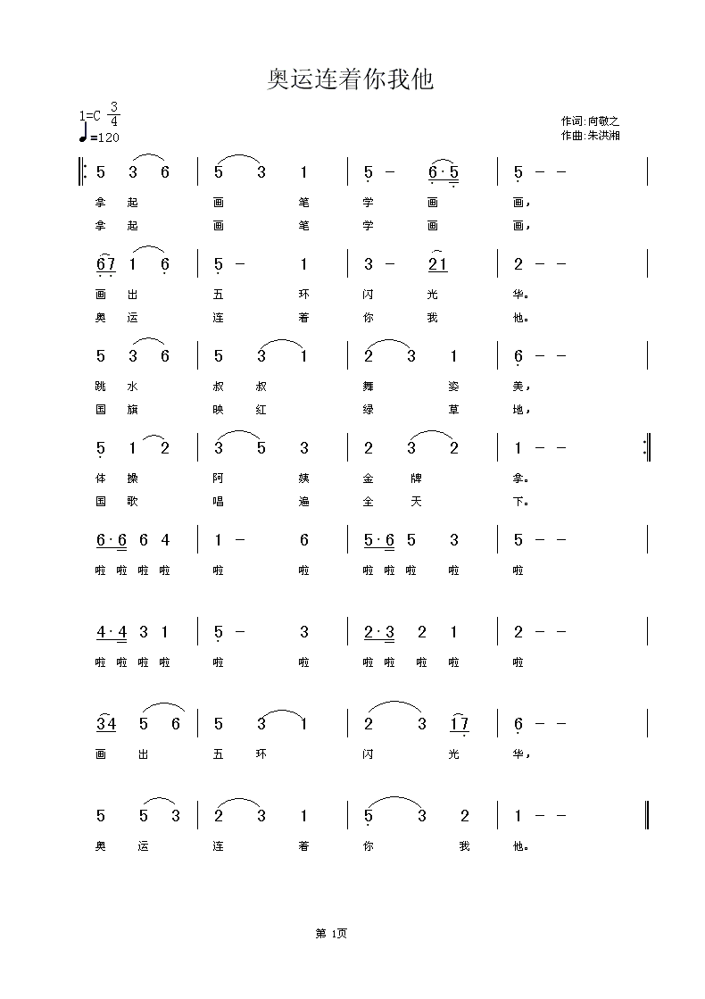 奥运连着你我他简谱上传者为网友上传,原创作者为网络转载,歌曲原唱歌手为佚名,本简谱为图片格式,表现形式为,音乐性质为流行金曲。