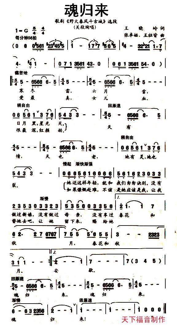 魂归来简谱上传者为网友上传,原创作者为网络转载,歌曲原唱歌手为佚名,本简谱为图片格式,表现形式为,音乐性质为流行金曲。