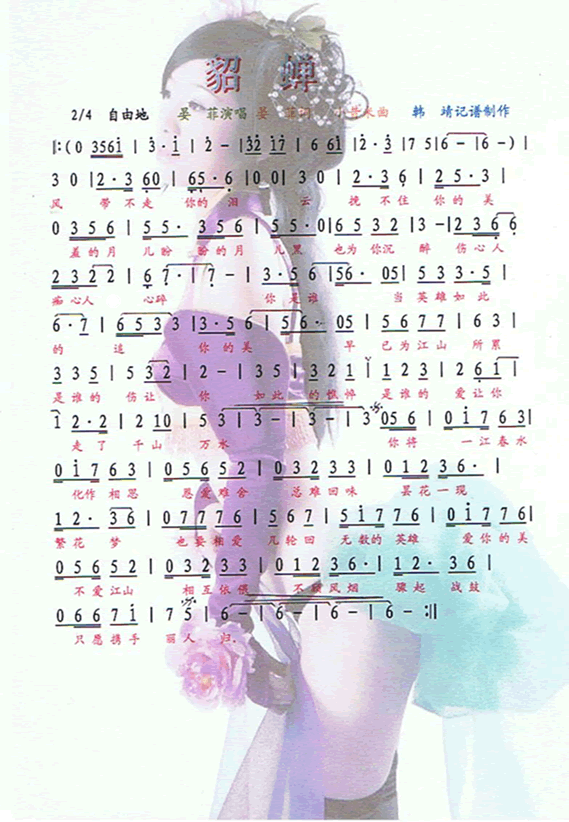貂蝉简谱上传者为网友上传,原创作者为网络转载,歌曲原唱歌手为佚名,本简谱为图片格式,表现形式为,音乐性质为流行金曲。